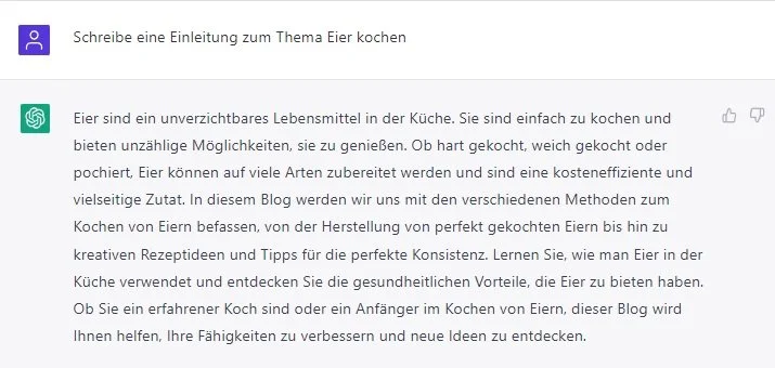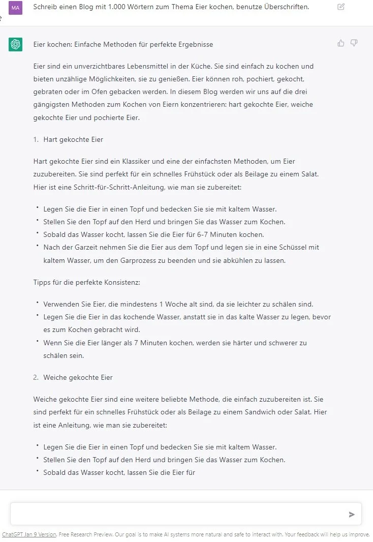 Für unseren Test haben wir ein Thema gewählt, dass vielleicht nicht jedem als erstes in den Sinn gekommen wäre: Eier kochen. Warum? Das hat mehrere Gründe, die eng mit den Eindrücken zusammenhängen, die wir bereits aus LinkedIn & Co. gewinnen durften. Dabei greifen wir etwas vor, denn auch ChatGPT hat Schwächen. Zum einen ist die Datenbank des Chatbots nicht aktuell. Das Wissen von ChatGPT reicht bis ins Jahr 2021 – das hat uns die AI selbst gesagt! (Stand Januar 2023) Demzufolge hätte es gar keinen Sinn gemacht, einen aktuellen bzw. investigativen Beitrag schreiben zu lassen. Zudem haben wir erfahren, dass die künstliche Intelligenz gerne Infos zu vorhandenen Quellen hinzudichtet. Wir wollen natürlich auf keinen Fall, dass ein Text entsteht, der Informationen enthält, die wir aufgrund mangelnden Wissens nicht verifizieren können. Ein profanes Thema wie dieses schadet wohl aber niemandem.