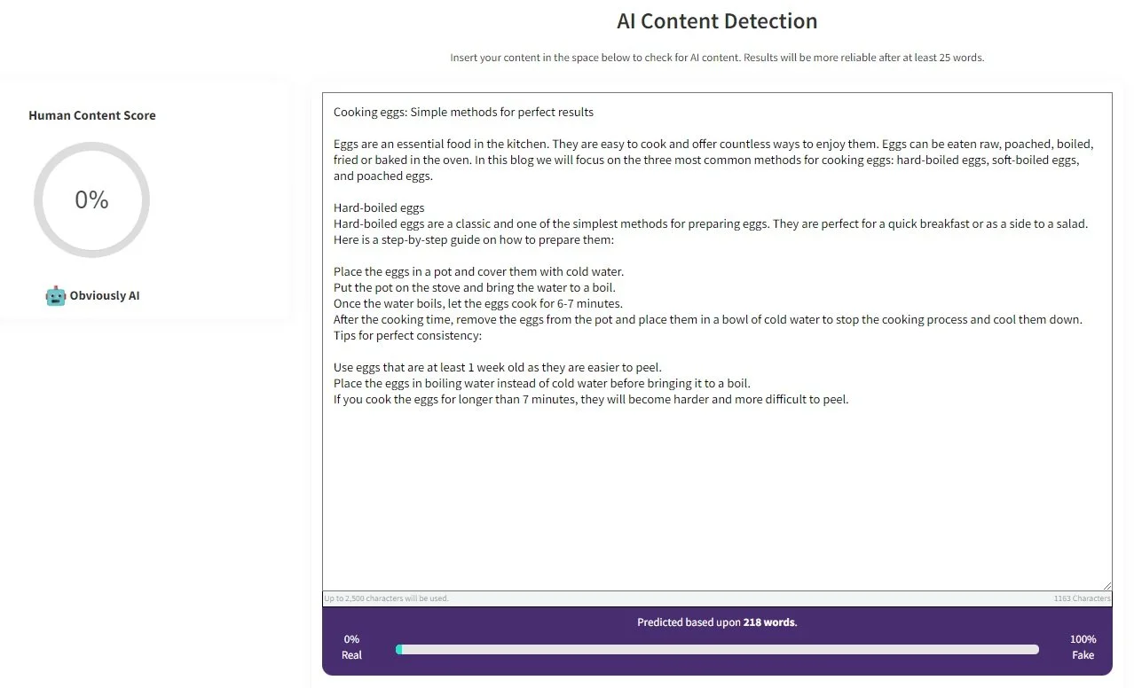 Wir wollten natürlich wissen, ob ChatGPT ein solches Tool überlisten kann und staunten nicht schlecht. Das Ergebnis: ja! Der Detektor bescheinigte uns fälschlicherweise, dass unser AI-generierter Content zu 100% von Menschenhand geschrieben sei.